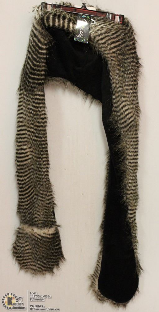 LONG BROWN ZEBRA FUZZY HAT WITH MITTS