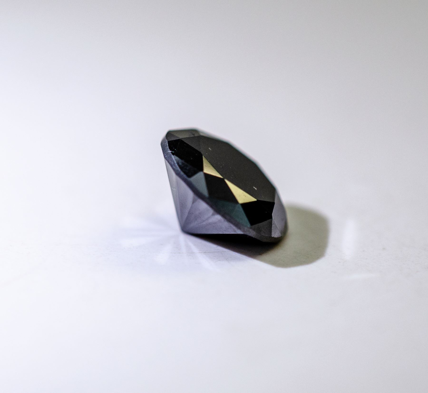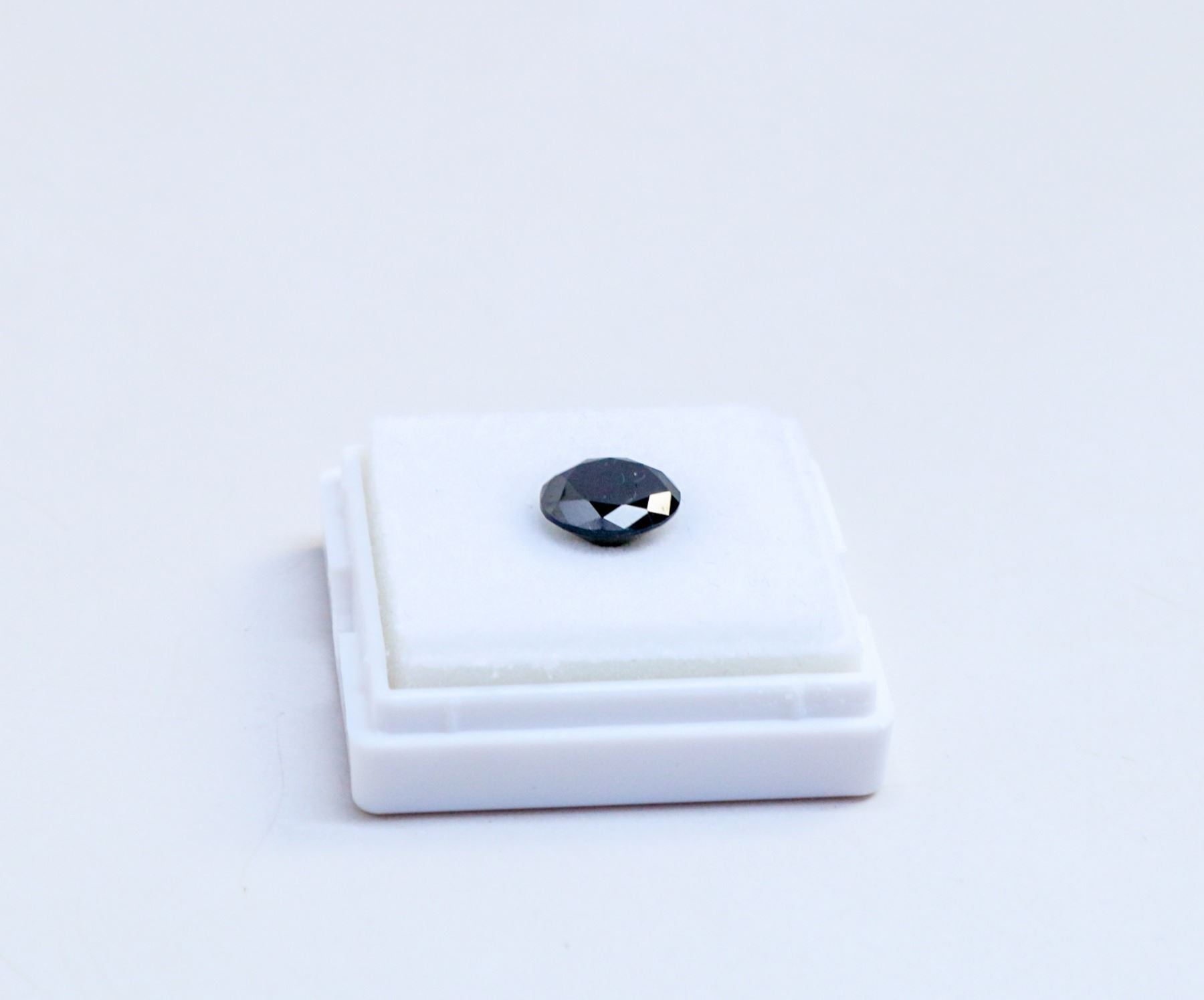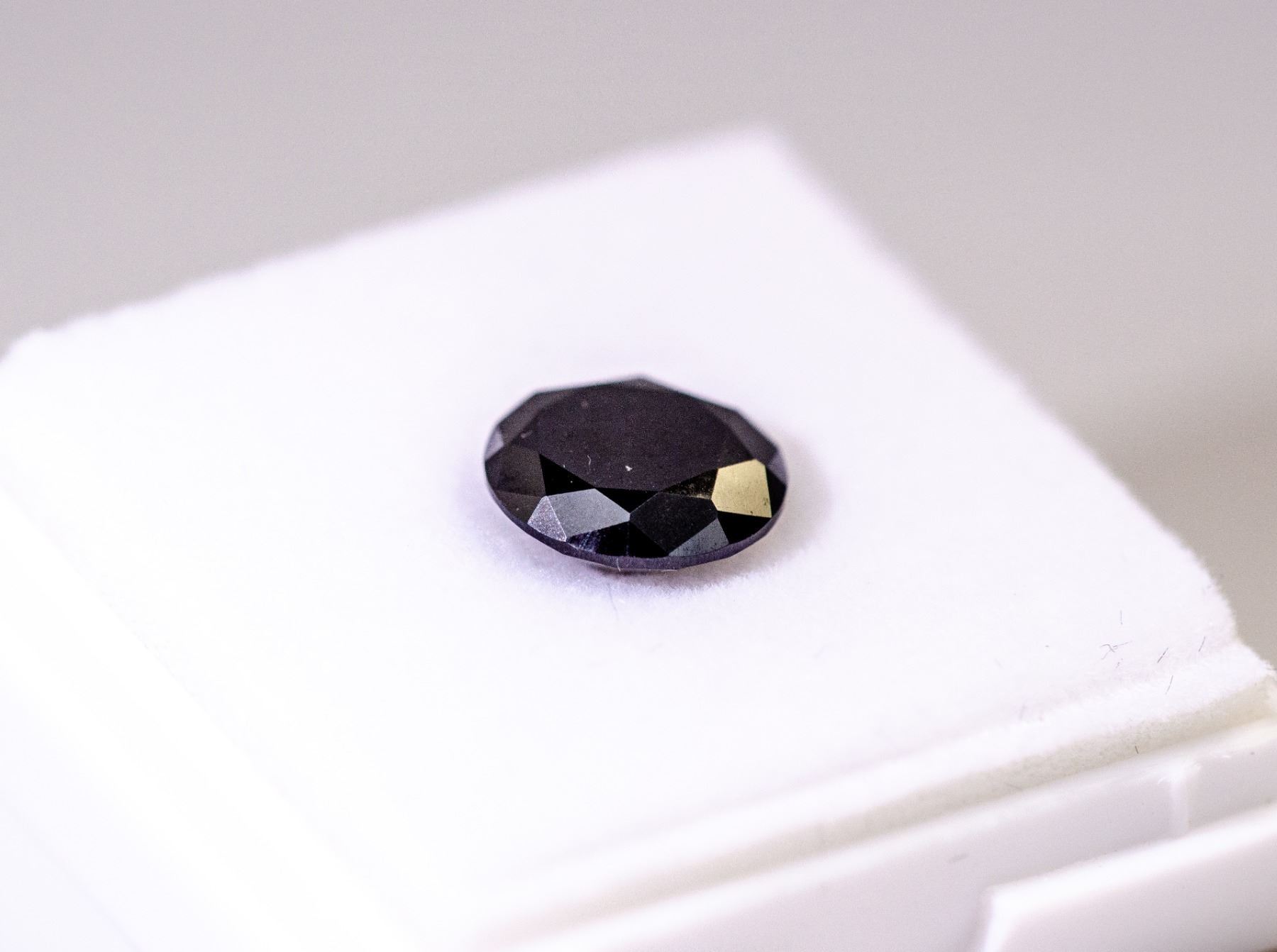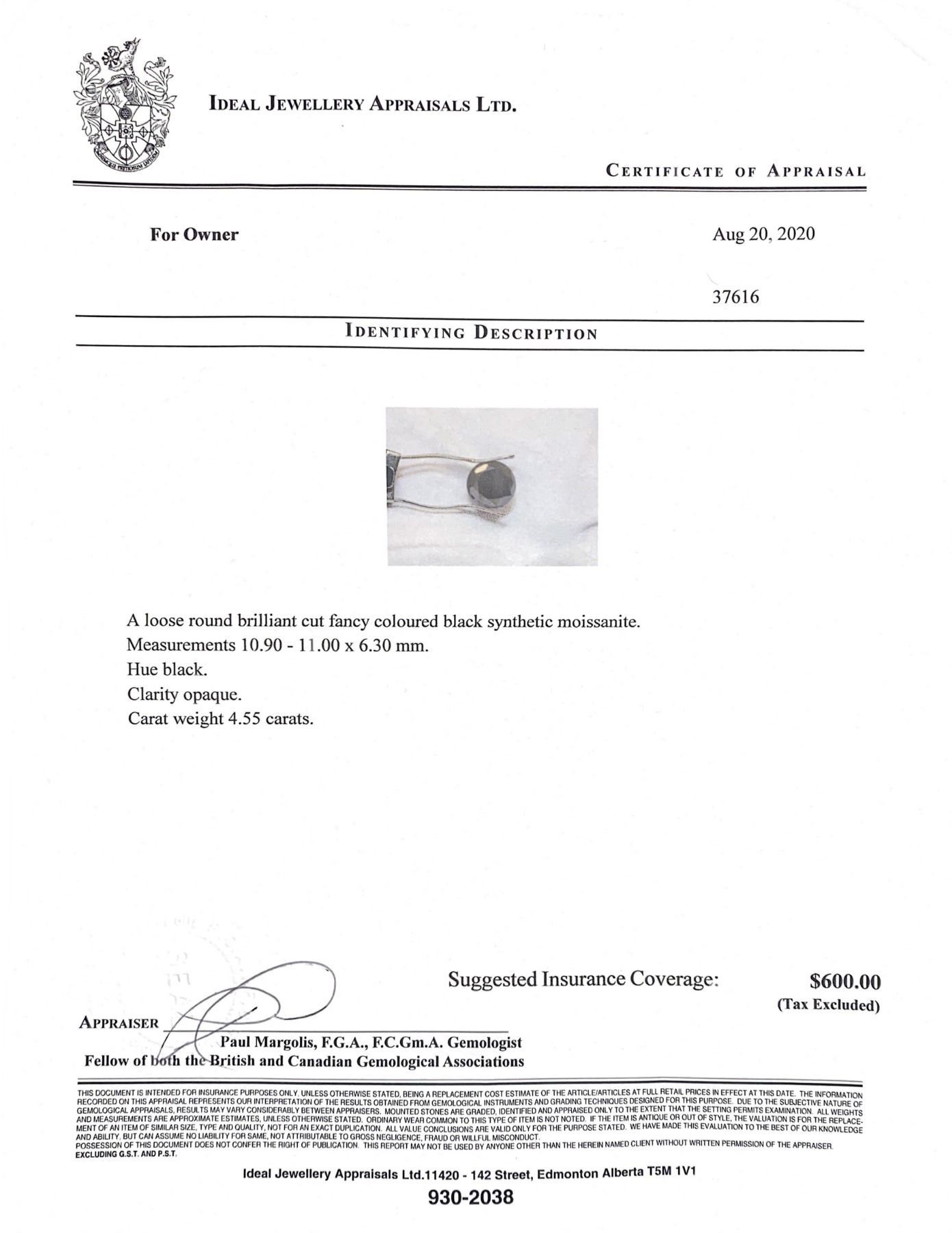 A LOOSE ROUND BRILLIANT CUT FANCY COLOURED BLACK SYNTHETIC MOISSANITE. MEASUREMENTS 10.90- 11.00 X 6.30 MM HUE BLACK CLARITY OPAQUECARAT WEIGHT 4.35 CARATS . CERTIFICATE OF APPRAISAL FROM LOCAL APPRAISER, SUGGESTED INSURANCE COVERAGE $600.00.