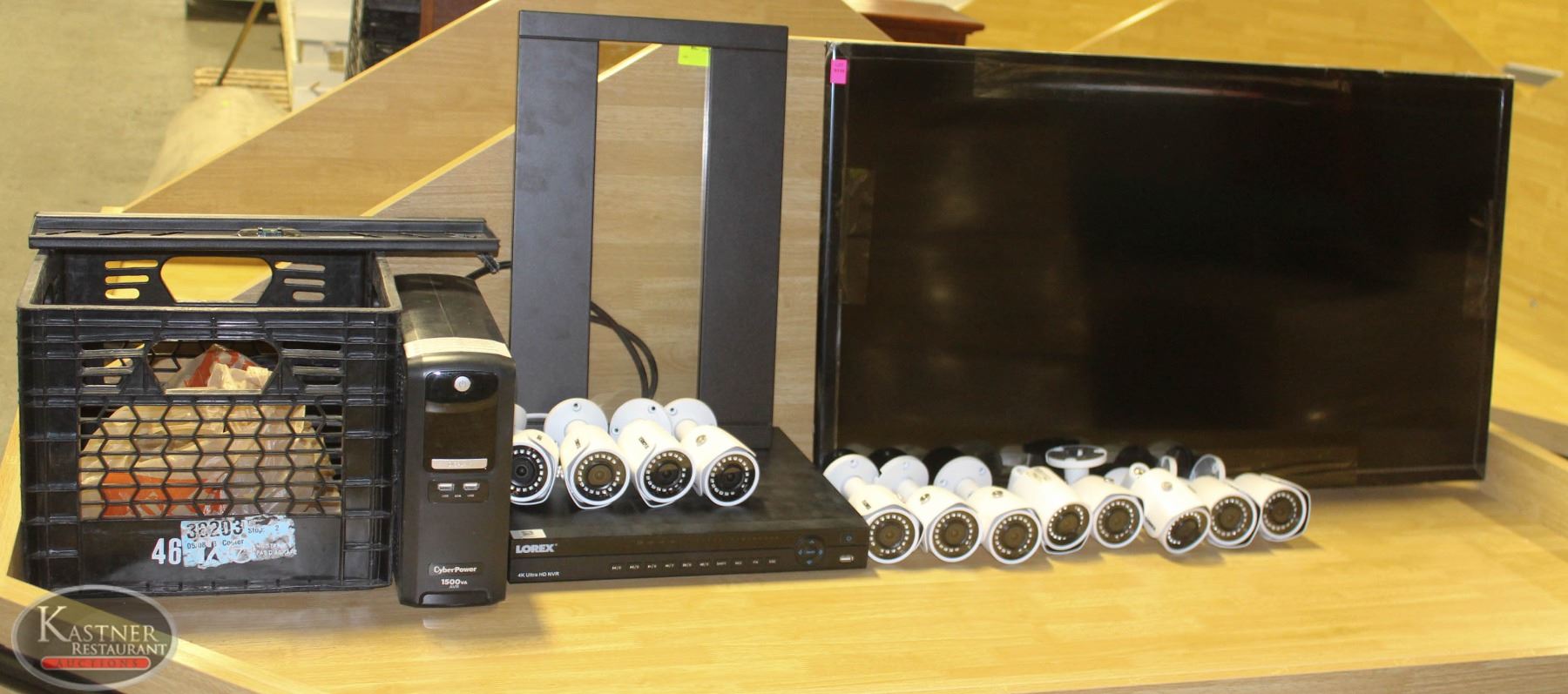 W/ WALLMOUNT & 12 SECURITY CAMERA'S, 1500 V.A. BACKUP POWER SUPPLY(CYBERPOWER). TV MODEL# UN40M5300, 35W ( STILL WRAPPED IN FILM - NO SCRATCHES). LOREX RECEIVER: 16 CHANNEL NVR 4K 2HD 1690E 60HZ MODEL# NR916-N, INPUT: AC 100V-240V @ 3.5A, OUTPUT: 12V DV @ 5A + 52V1 2.5A. *LESS THAN 6 MONTHS OLD/USED* WIRES ARE CUT. SOLD AS IS, NO RECONSIGNMENTS. WIRING CUT