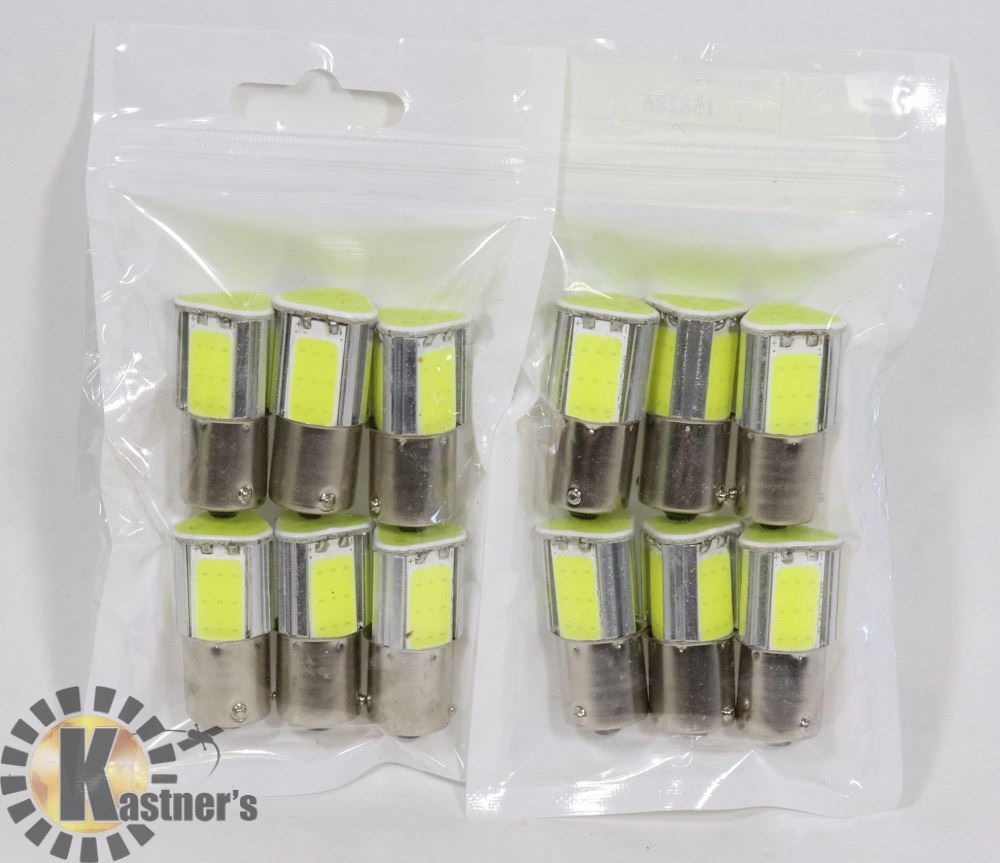 2 PACKS OF 6 NEW LED BULBS (12 IN TOTAL) FOR RV/AUTO. COOL WHITE 6500K REPLACES STANDARD BULBS 1156-1141-BA15S ETC. SINGLE SOCKET BAYONET BASE. COMPATIBLE BULBS. NEW BRIGHT 3+1 COB CHIPS