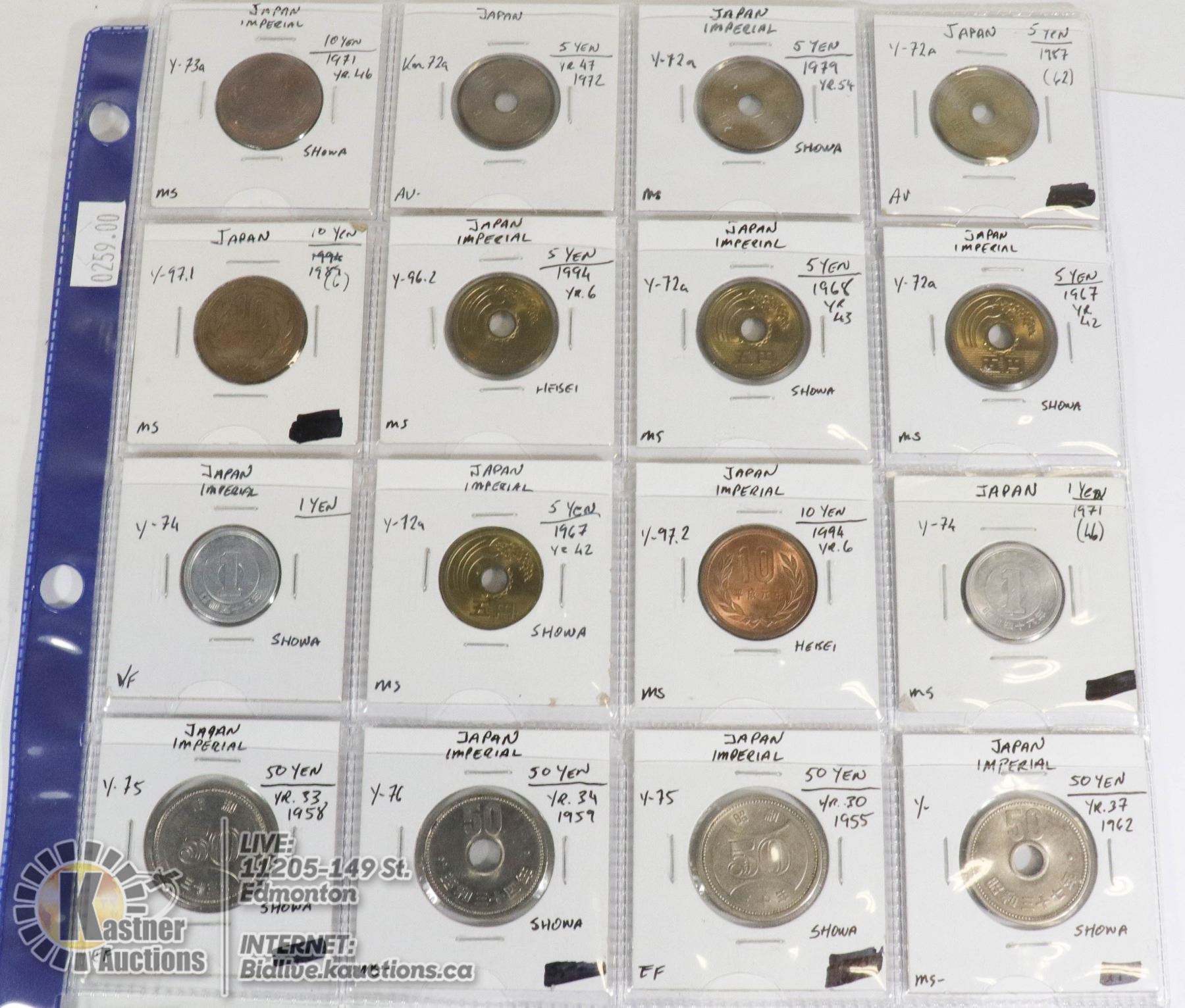 MIXED SHEET OF 16 JAPANESE COINS IN PAGE FROM ESTATE. GOOD MIX WITH MANY DIFFERENT DENOMINATIONS AND DATES