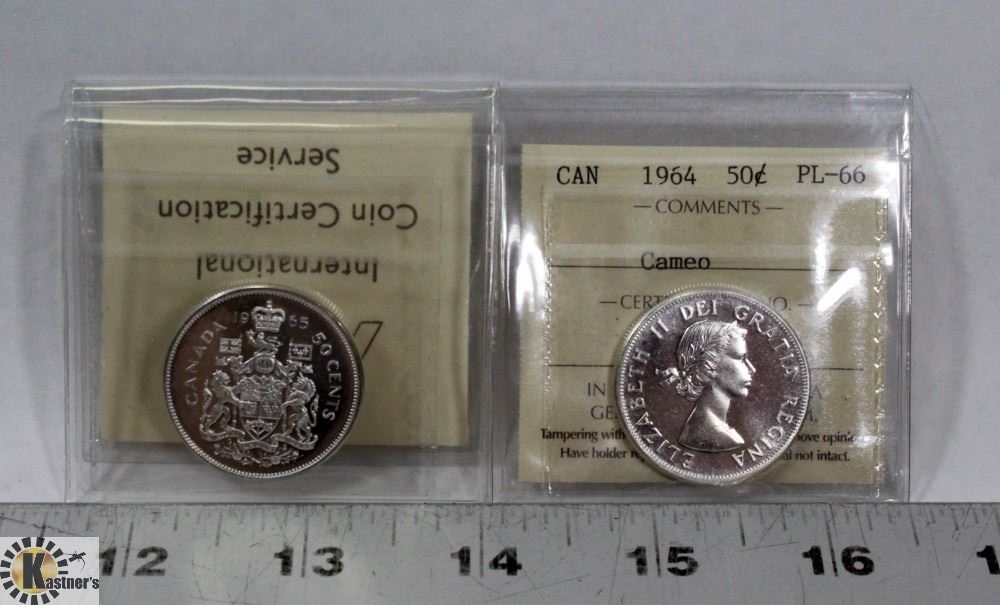 LOT OF 2 CANADIAN 50 CENT SILVER COINS 1965-PL66,