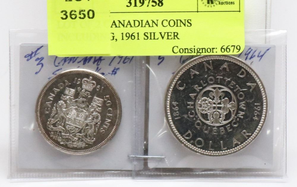 HALF DOLLAR AND 1964 PROOF SILVER DOLLAR. CURRENCY