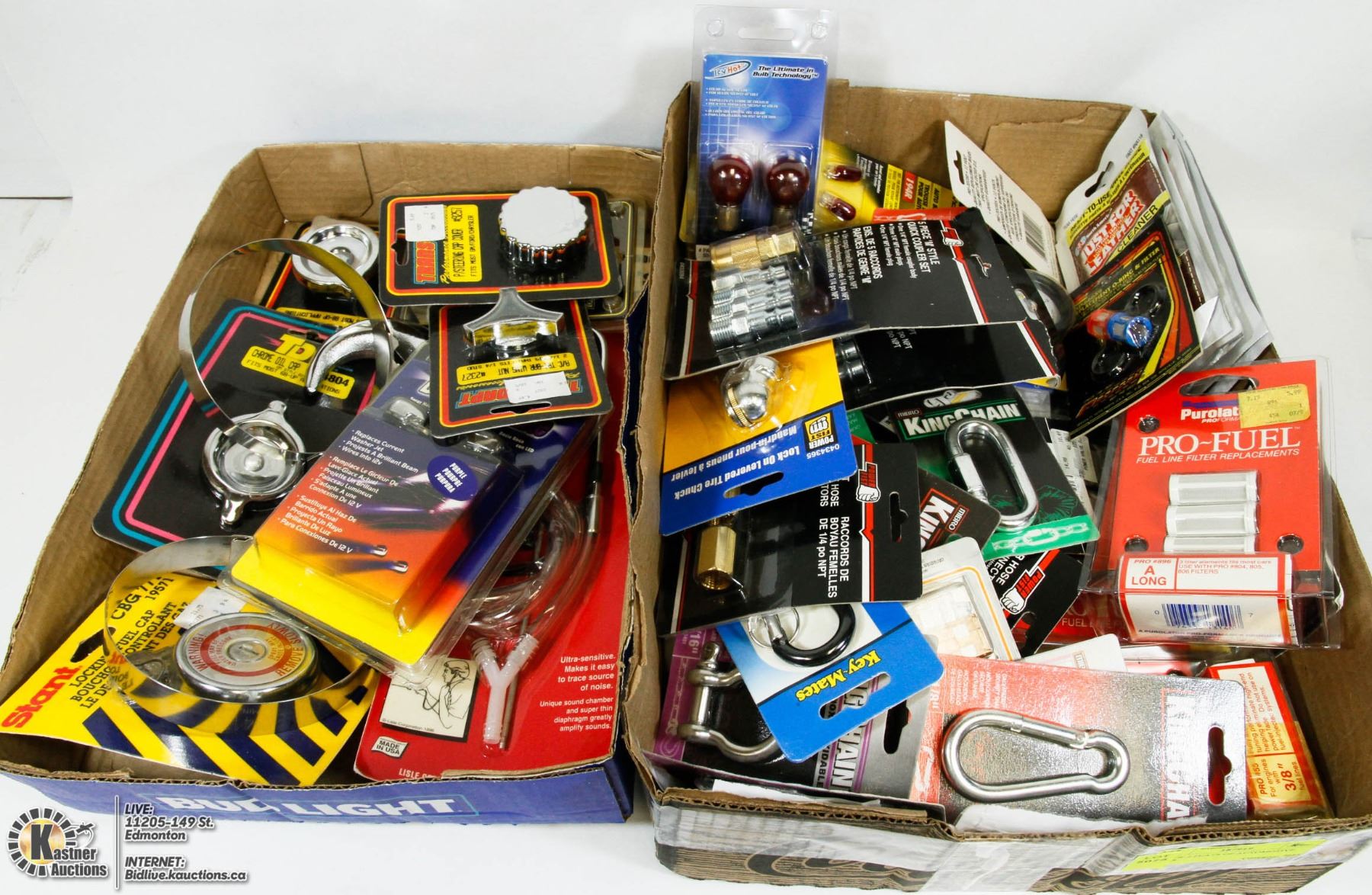 INCLUDES MECH STETHOSCOPE, LOCKING GAS TANK COVERS, CHROME TOW HOOKS, LOTS OF VARIOUS BULBS, AIR COMPRESSOR COUPLINGS, FUSES, FILTERS, QUICK LINKS, HOSE CLAMPS, ETC. AUTO.