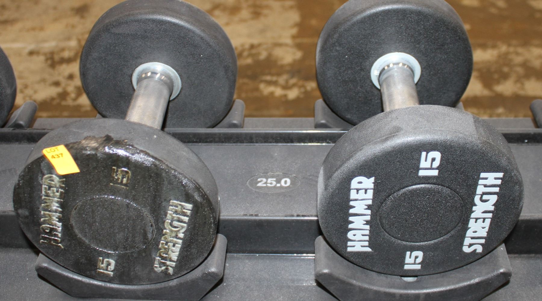 LOT OF 2 HAMMER STRENGTH 15LB DUMBELLS