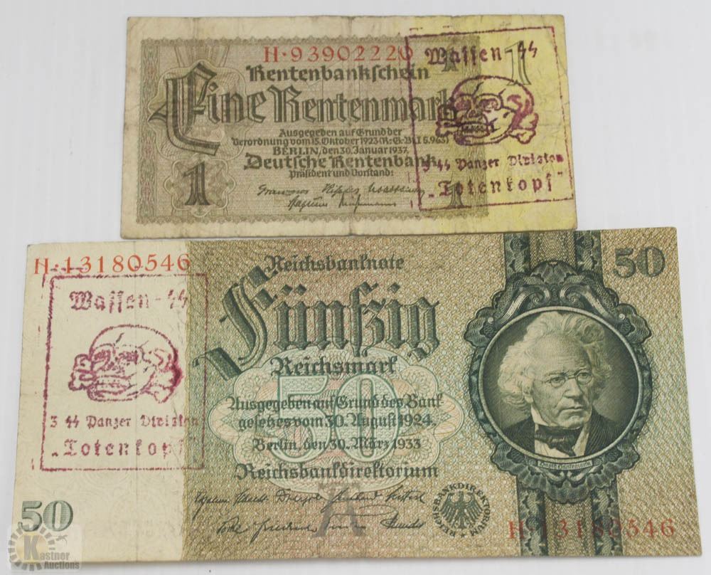 LOT OF 2 NAZI WWII BANK NOTES STAMPED TOTENKOPF