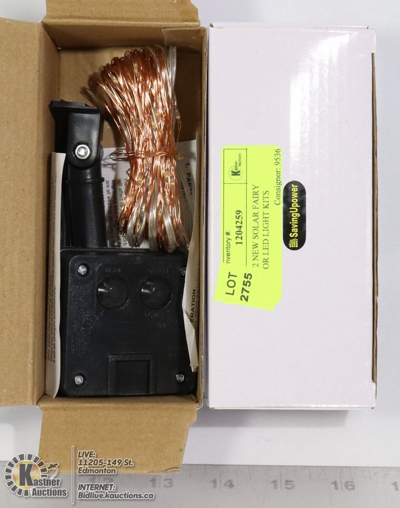 2 NEW SOLAR FAIRY LED LIGHTS FOR OUTDOORS. WARM WHITE. SOLID ON OR BLINKING FUNCTION. 100 LED'S - STRING LIGHTS MADE OF COPPER WIRE. AUTO PHOTO SENSOR GOES ON AT NIGHT OFF IN THE DAY AND CHARGES LITHIUM ION BATTERY FROM THE SUN. INCLUDES GROUND STAKE FOR THE SOLAR PANEL. CONVENIENT AND SAFE FOR INDOORS OR OUTDOORS.