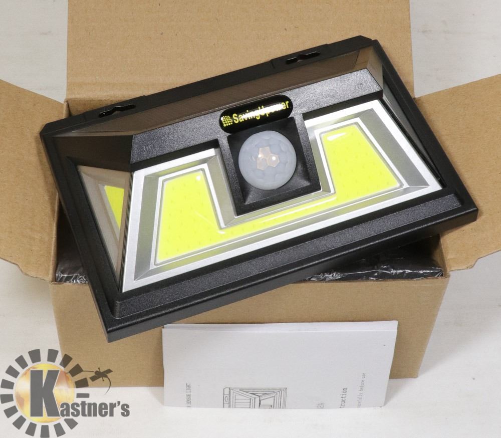 TWO HI BRIGHTNESS SOLAR SECURITY MOTION PIR SENSOR LIGHTS 6500K. COB CHIP LED. MODES-ON OFF, AUTO NIGHT, DIM AND HIGH. NO WIRING REQUIRED. BBQ, SECURITY, ENTRANCE, GATE, STAIRS, DECK, SHED, DRIVEWAY, ETC.