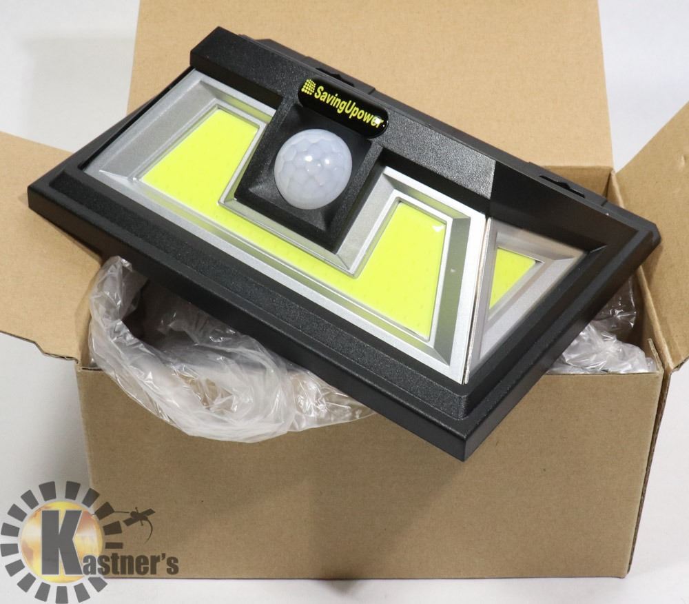 TWO HI BRIGHTNESS SOLAR SECURITY MOTION PER SENSOR LIGHTS 6500K. HI QUALITY COB CHIP LED. MODES-ON OFF, AUTO NIGHT, DIM AND HIGH. NO WIRING REQUIRED. BBQ, SECURITY, ENTRANCE, GATE, STAIRS, DECK, SHED, DRIVEWAY, ETC.