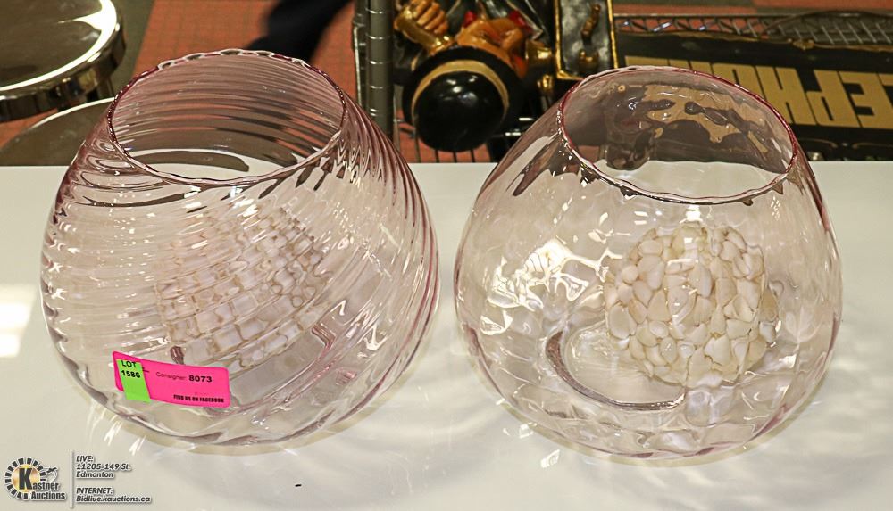 LOT OF 2 SHOWHOME PINK VASES WITH SEASHELL BALLS