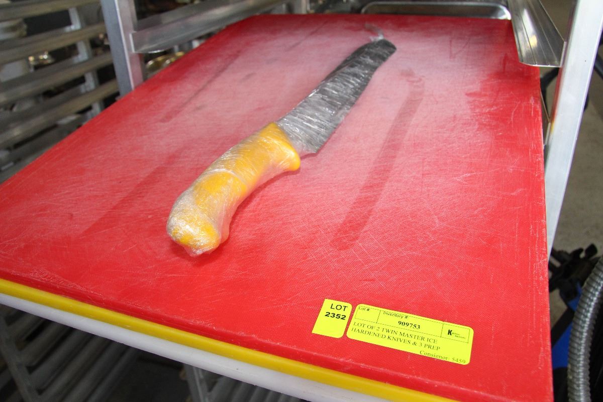 CUTTING BOARDS. KNIVES ARE A CHEFS KNIFE 11.5" BLADE AND A CARVING KNIFE 11.5" BLADE. BOTH KNIVES COME WITH BRIGHT YELLOW EROGONOMICALLY SHAPED HANDLES. CUTTING/PREP BOARDS ARE 18"W X 24"L