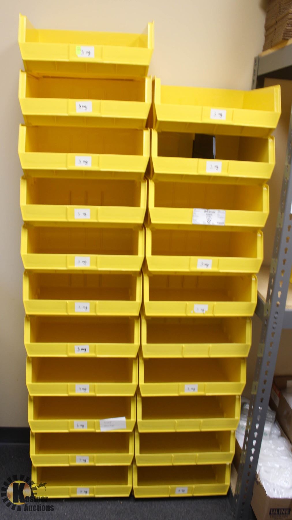 LOT OF 21 YELLOW PLASTIC STACKING STORAGE BINS