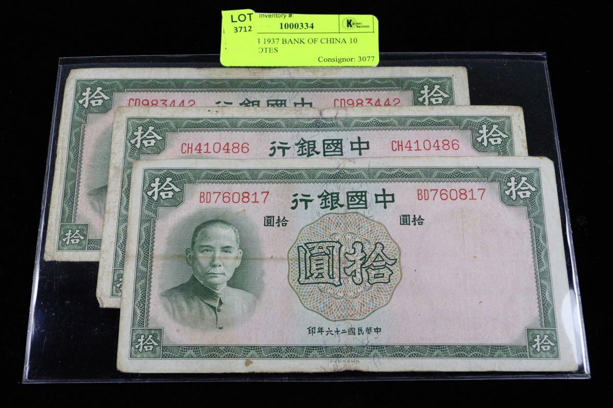 LOT OF 3 1937 BANK OF CHINA 10 YUAN NOTES