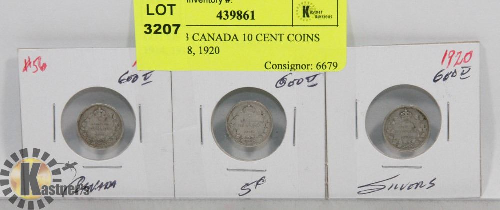 LOT OF 3 CANADA 10 CENT COINS 1914, 1918, 1920
