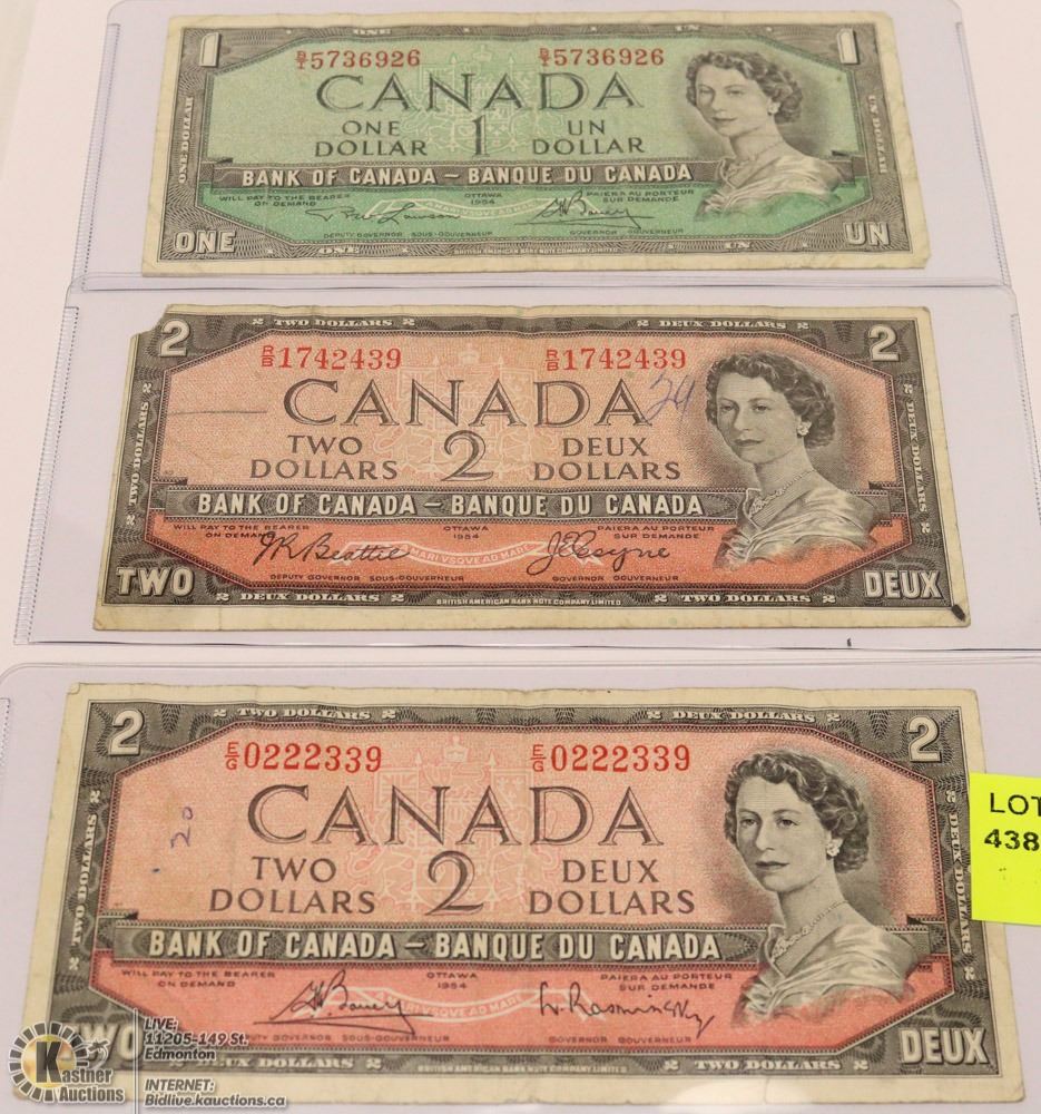 LOT OF 3 CANADIAN BILLS, TWO $2 BILLS & ONE $1