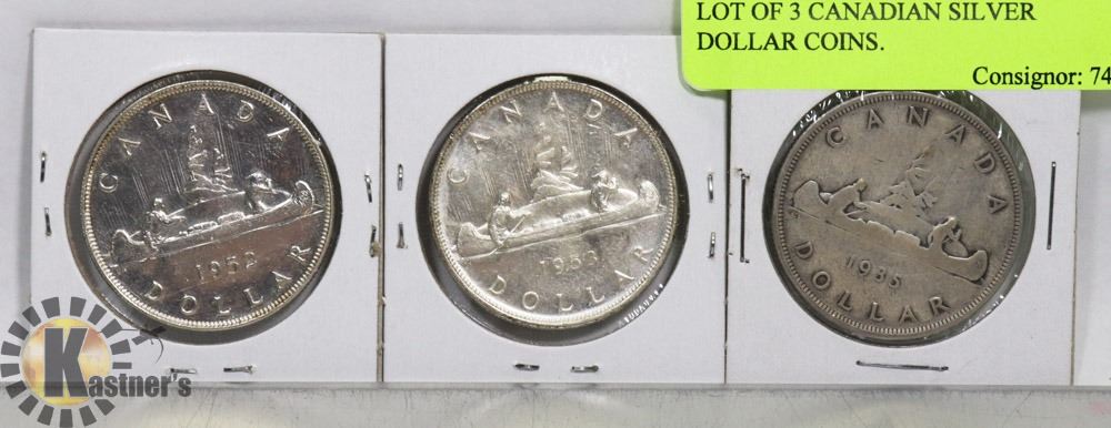 LOT OF 3 CANADIAN SILVER DOLLAR COINS.