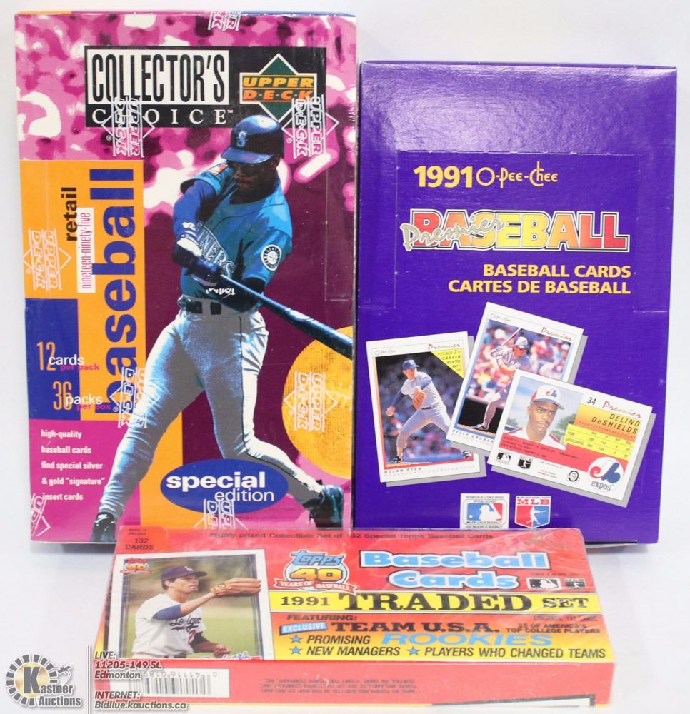 1990 TOPPS FACTORY SEALED (132 CARDS), 1994 UPPER DECK BASEBALL FACTORY SEALED (36 PACK OF 12 CARDS EACH) AND 1991 OPEECHEE PREMIERE BASEBALL BOX (36 CARDS OF 7 CARDS EACH)