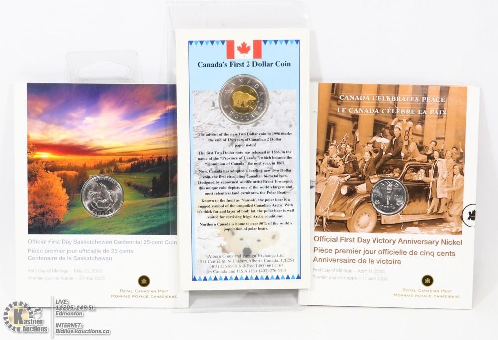 1996 FIRST TWO DOLLAR COIN; 2005 FIRST DAY SASKATCHEWAN CENTENNIAL 25 CENT; 2005 FIRST DAY VICTORY ANNIVERSARY NICKEL. CURRENCY