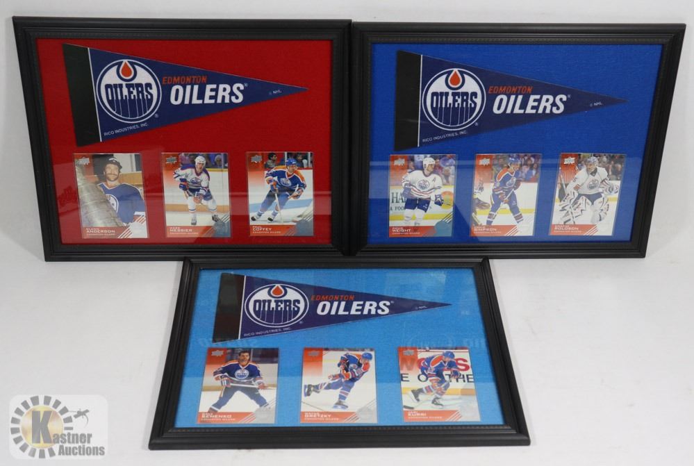 LOT OF 3 EDMONTON OILERS FRAMED CARD PICTURES.