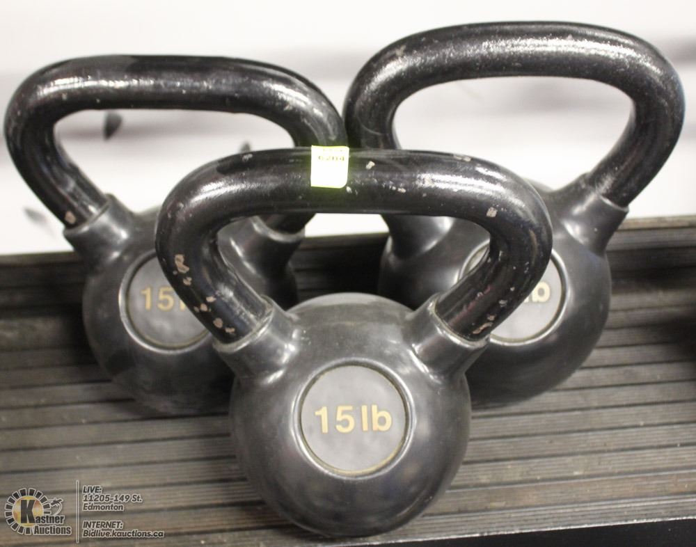 LOT OF 3 KETTLEBELLS, TWO 15LB & ONE 20LB