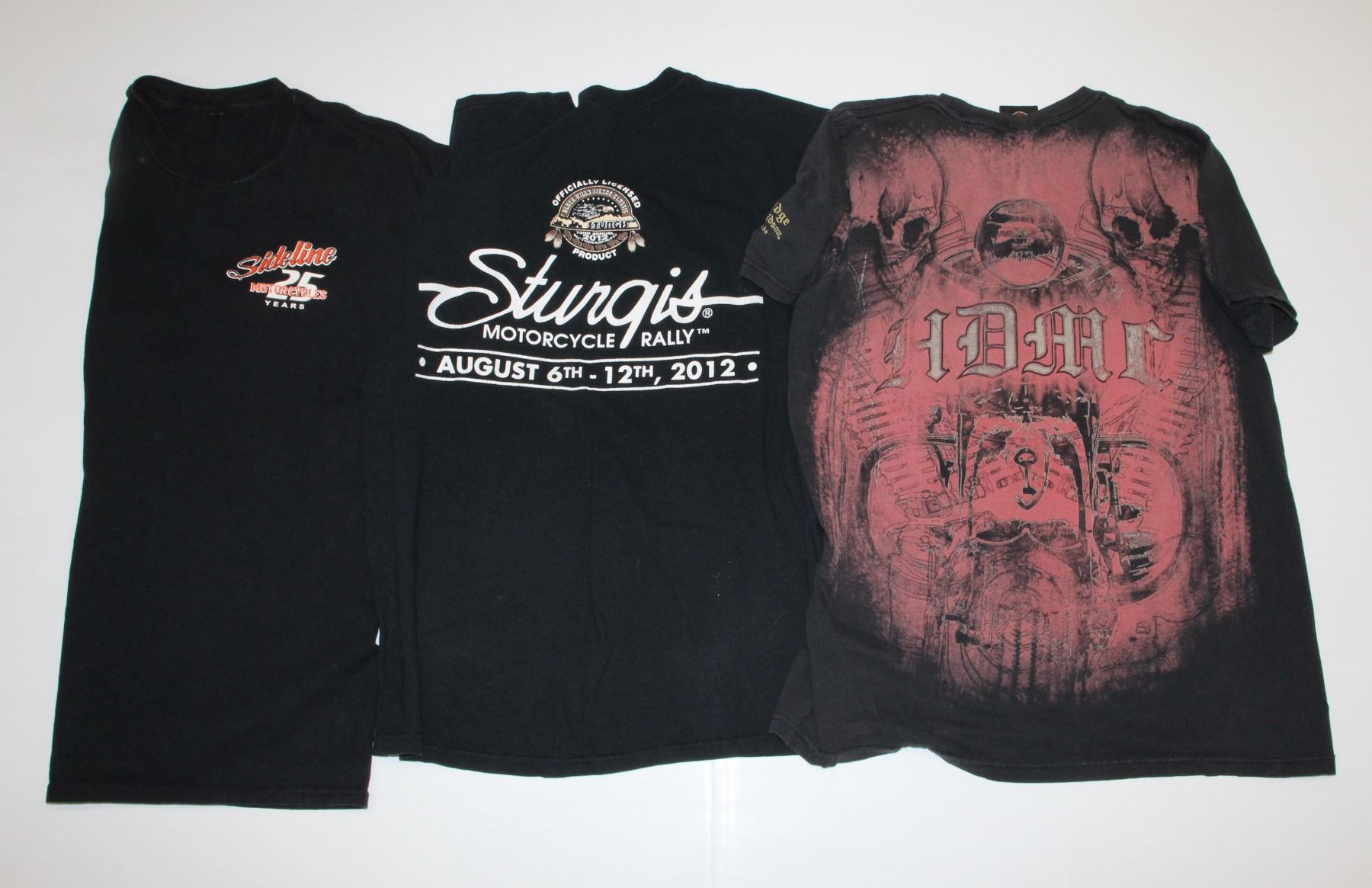 T-SHIRTS, SIZE MEDIUM. STURGIS BLACK HILLS RALLY 2012, HARLEY DAVIDSON LETHBRIDGE VF IMAGE WEAR INC TAG PARTIALLY REMOVED AND SIDELINE MOTORCYCLES OLD SCHOOL 25TH ANNIVERSARY T-SHIRT SIZE MEDIUM/LARGE