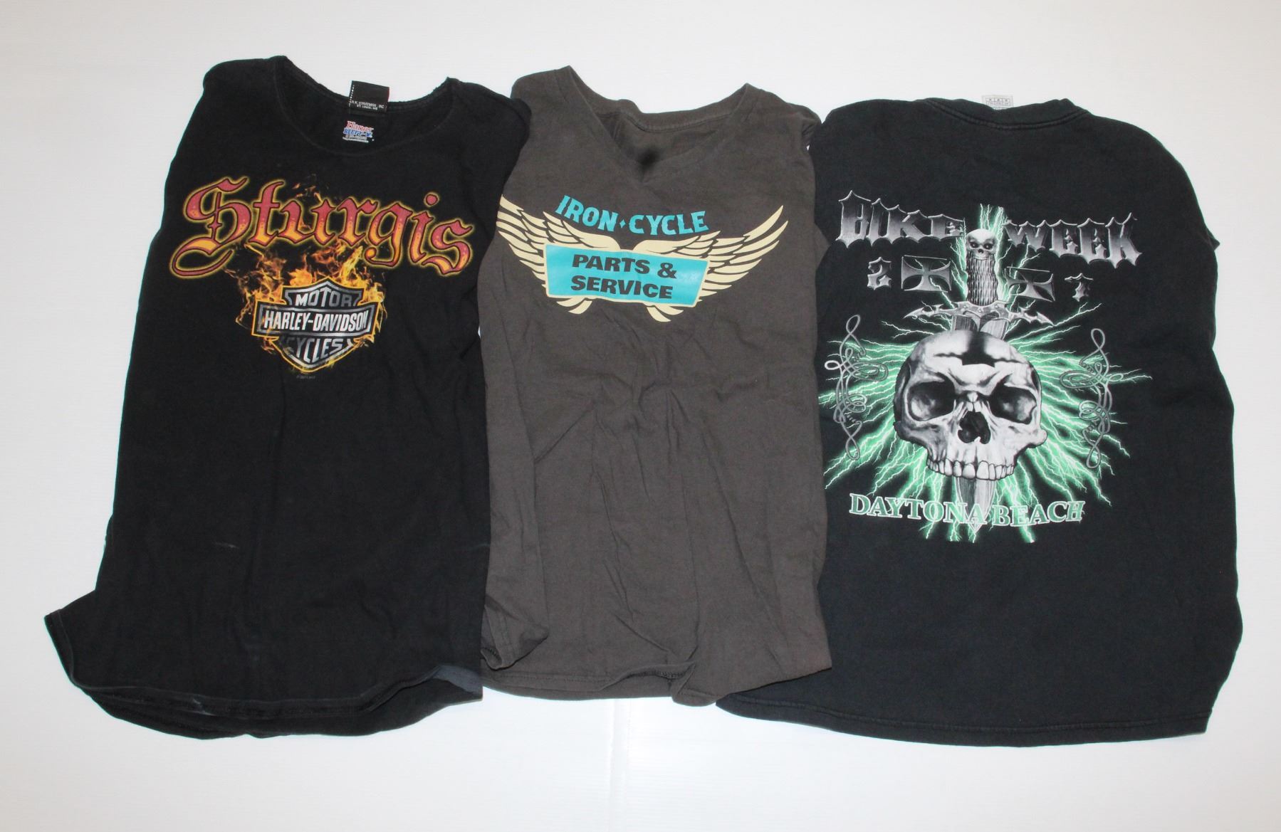 T-SHIRTS SIZE MEDIUM BIKE WEEK DAYTONA BEACH 2007 DELTA PRO WEIGHT TAG MADE IN MEXICO, IRON CYCLE MOTORCYCLES LETHBRIDGE NO TAG AND HARLEY DAVIDSON STURGIS LONG SLEEVE SOUTH DAKOTA HANES BEEFY-T MADE IN HAITI