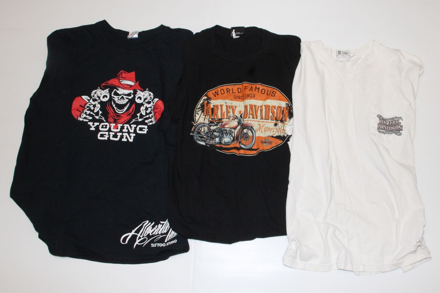 LARGE. HARLEY DAVIDSON BELIZE CENTRAL AMERICA VIKER PRODUCTIONS TAG WORN, HARLEY DAVIDSON GRAND CANYON WORN PRESCOT ARIZONA 2009 WORN CONDITION BEEFY-T TAG WORN, HOLES IN SHIRT DISTRESSED LONG SLEEVE TEE, AND YOUNG GUN ALBERTA TATTOO STUDIOGILDAN TEE MADE IN HONDURAS,