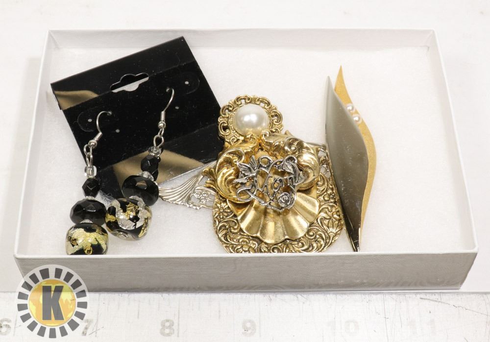 INCLUDED ARE MINT SET OF EARRINGS, A MOTHERS DAY BROOCH AND PEARL BROOCH, EXCELLENT SHAPE.***ITEM IS LOCATED IN LETHBRIDGE ALBERTA, PICKUP IS AT OUR LETHBRIDGE LOCATION ONLY, WORLDWIDE SHIPPING IS AVAILABLE***