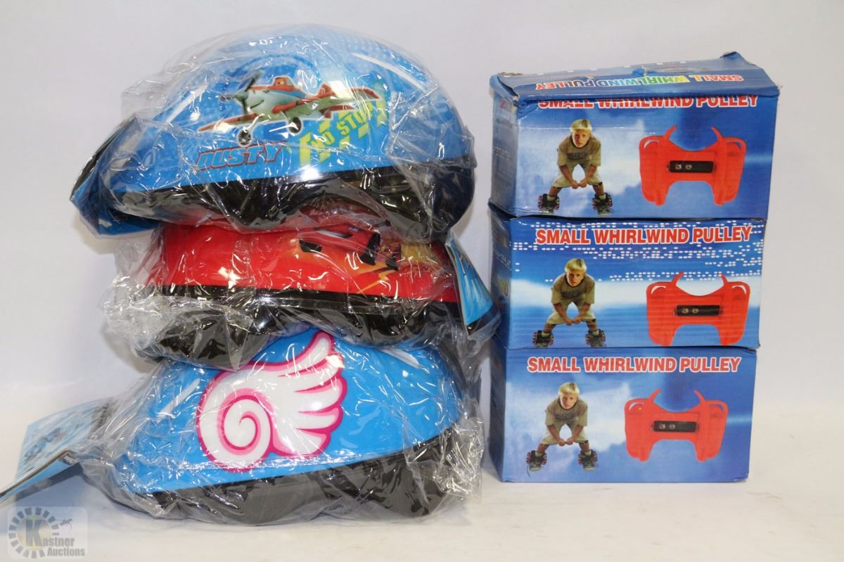 LOT OF 3 NEW CHILDS HELMETS & 3 WHIRLWIND PULLEY
