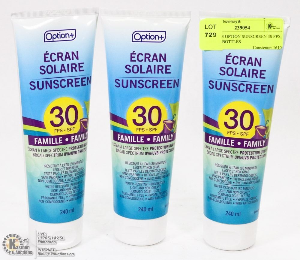 LOT OF 3 OPTION SUNSCREEN 30 SPF, - 240ML BOTTLES