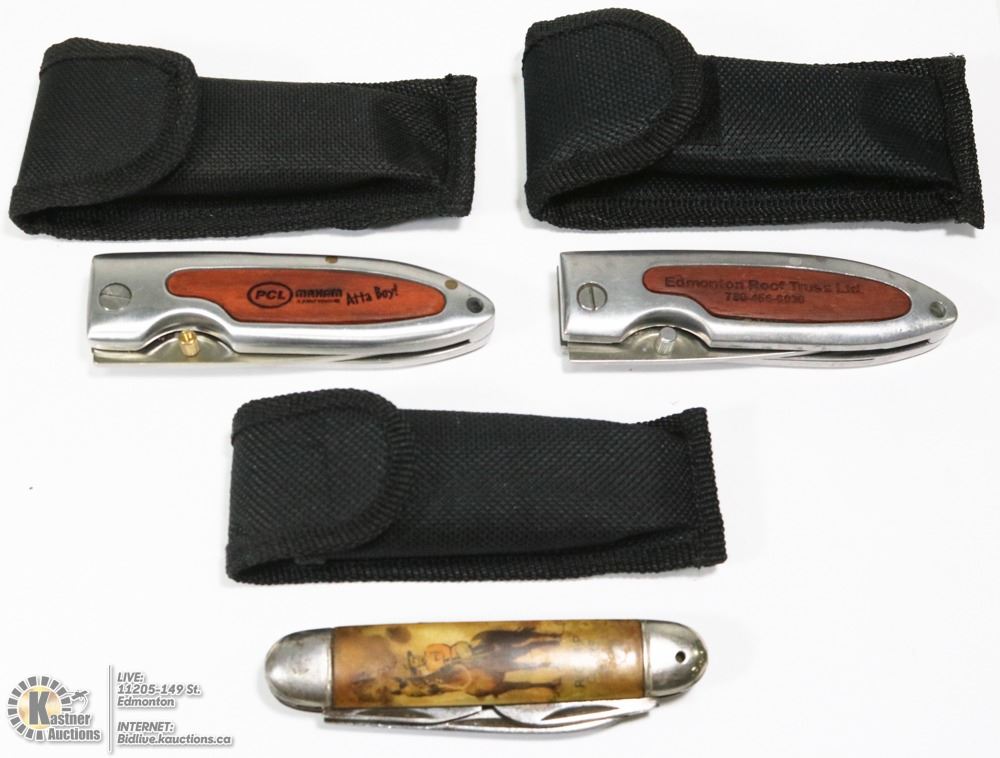 TWO ARE SINGLE BLADE GERMAN MADE MARKED ESP K&R ASI63770 & OTHER ONE IS MULTI BLADE MARKED SHEFFIELD, ENGLAND WITH RCMP IMAGE ON HANDLE. COLLECTIBLES.
