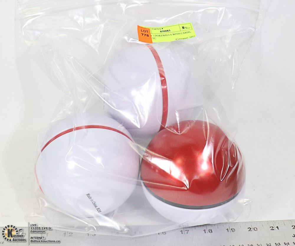 LOT OF 3 POKEBALLS WITH CARDS, DICE ETC.