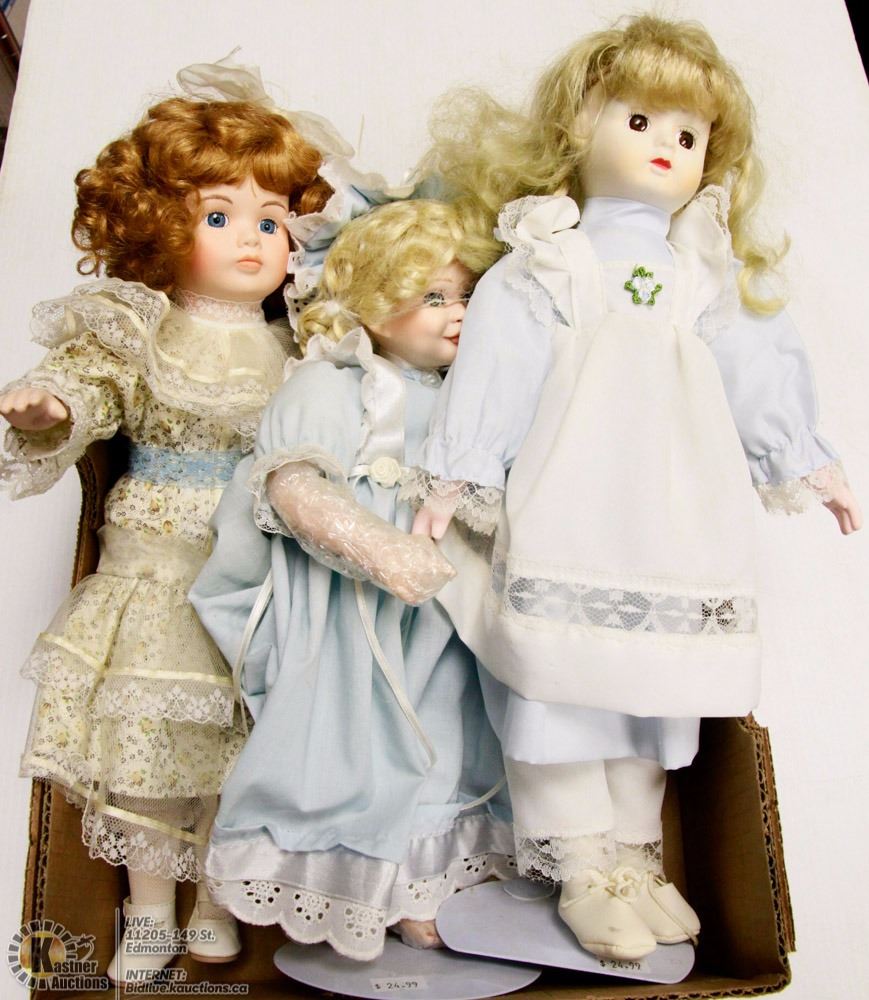 LOT OF 3 PORCELAIN DOLLS, 2 WITH STANDS