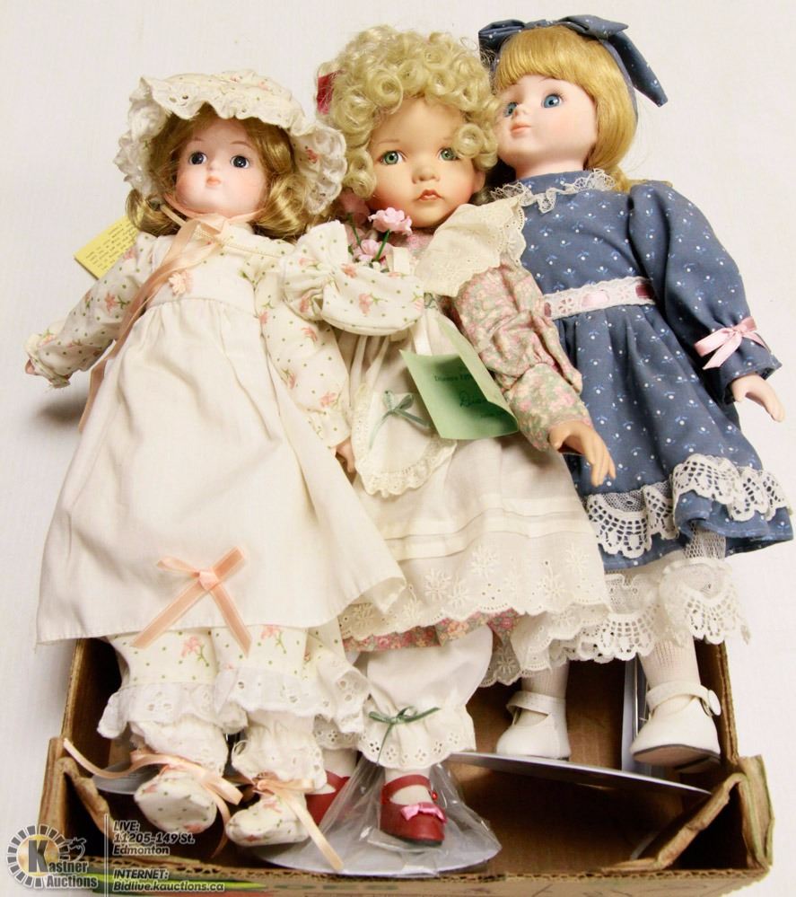 LOT OF 3 PORCELAIN DOLLS, ALL WITH STANDS