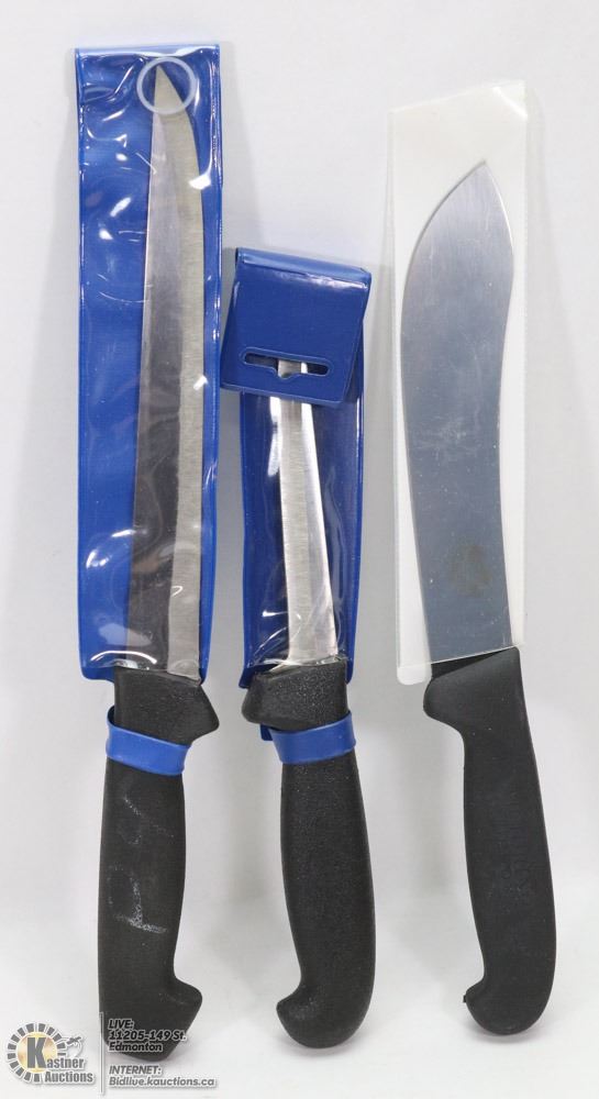 VICTORINOX 7" FIBROX PRO BUTCHER KNIFE; FROSTS 8" WIDE FILLET KNIFE; HOOK-EYE 5" BONING KNIFE. ALL VERY SHARP.