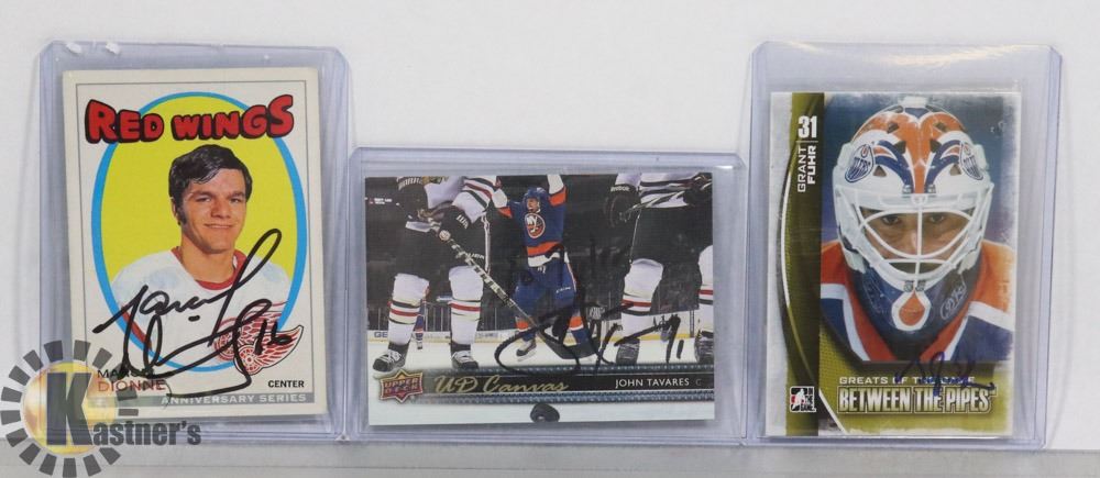 BTP CARD MASK, JOHN TAVARES AUTOGRAPHED NEW YORK ISLANDERS CARD, & AUTOGRAPHED MARCEL DIONNE DETROIT RED WINGS ROOKIE REPRINT.