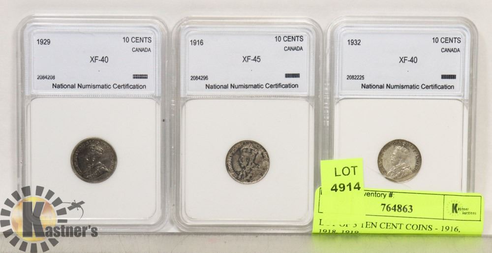 LOT OF 3 TEN CENT COINS - 1916, 1918, 1919.