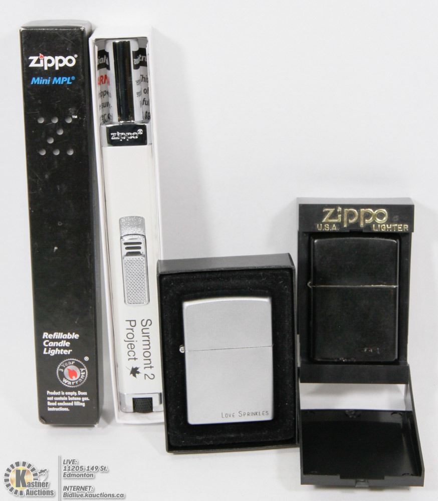 BLACK ZIPPO & CASE; SILVER ZIPPO & CASE (NEVER BEEN BURNT); NEW ZIPPO BUTANE CANDLE LIGHTER. COLLECTIBLES.