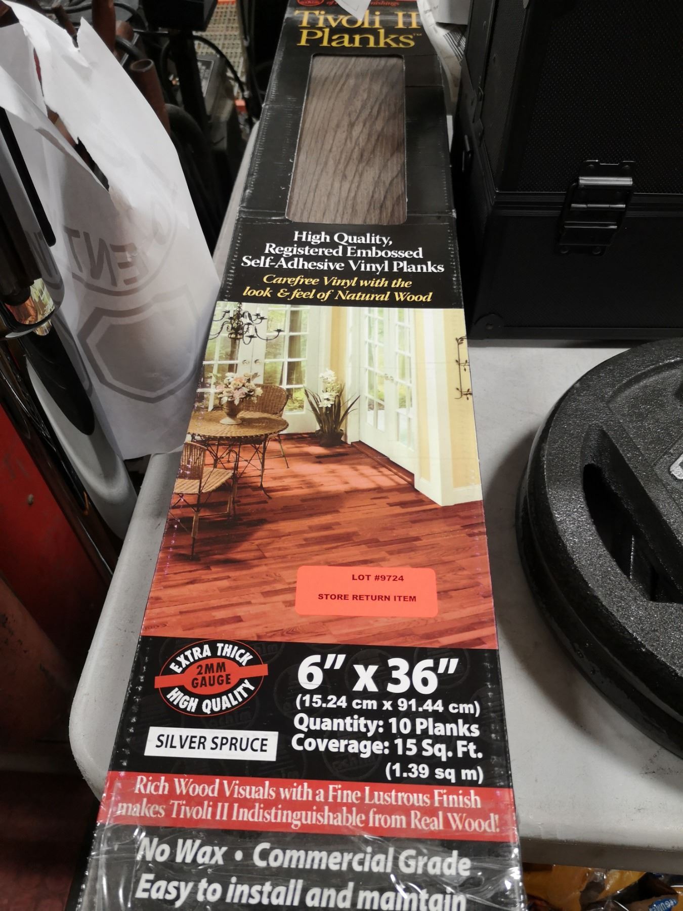 ADHESIVE VINYL FLOOR PANELS. EACH BOX CONTAINS 10 PLANKS 6" X 36". **THIS IS A STORE RETURNED ITEM, MAY NEED SOME LEVEL OF REPAIR SOLD AS IS**