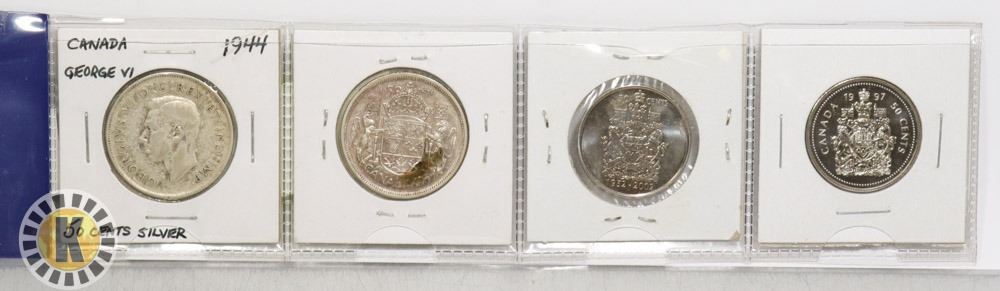SILVER 1944 50 CENT, SILVER 1955 ELIZABETH II, 1997 PROOF LIKE FINISH AND 2002 COMMEMORATIVE. GOOD LOT.***ITEM IS LOCATED IN LETHBRIDGE ALBERTA, PICKUP IS AT OUR LETHBRIDGE LOCATION ONLY, WORLDWIDE SHIPPING IS AVAILABLE***