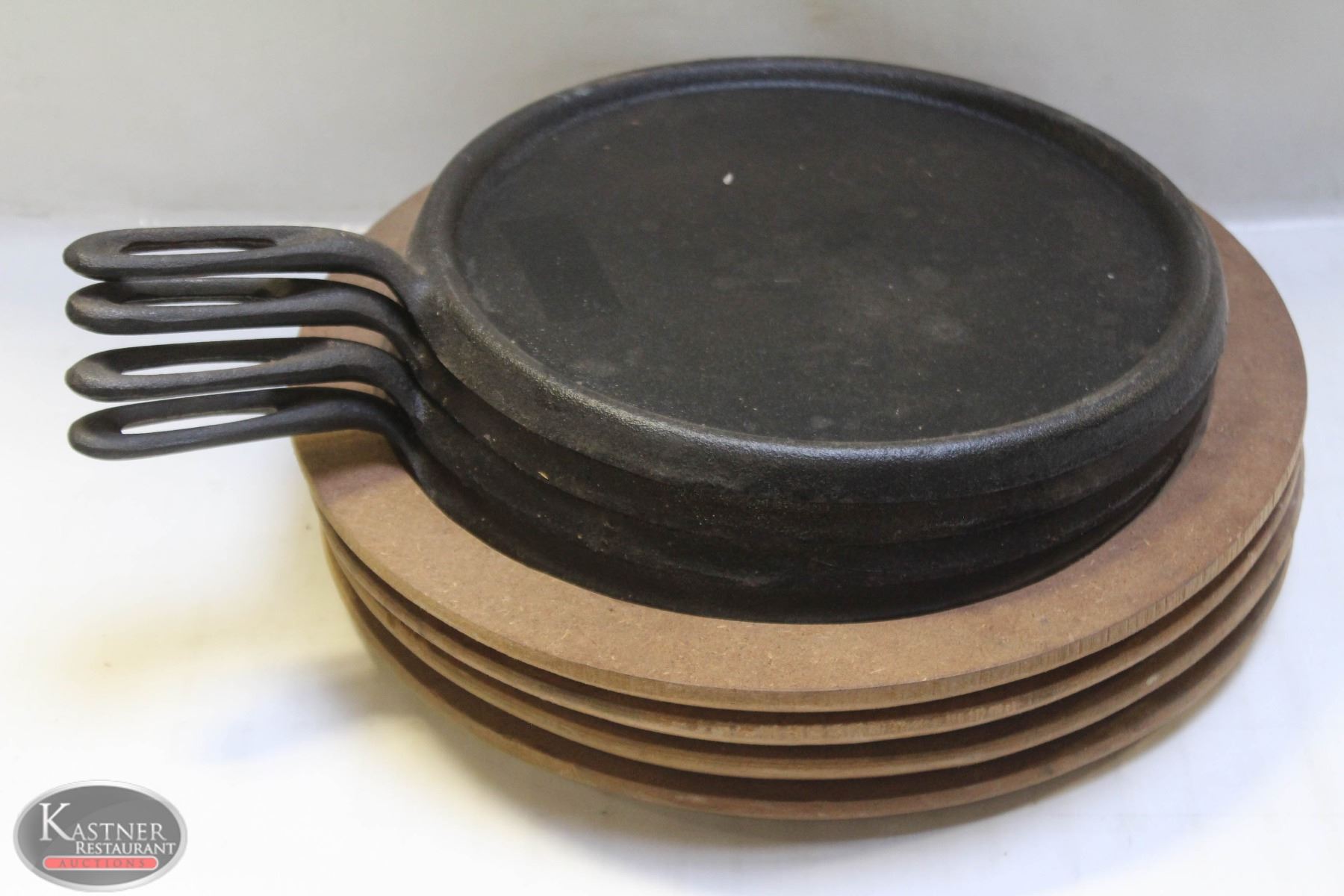 LOT OF 4 CAST IRON ROUND GRIDDLE W/ WOODEN COASTER