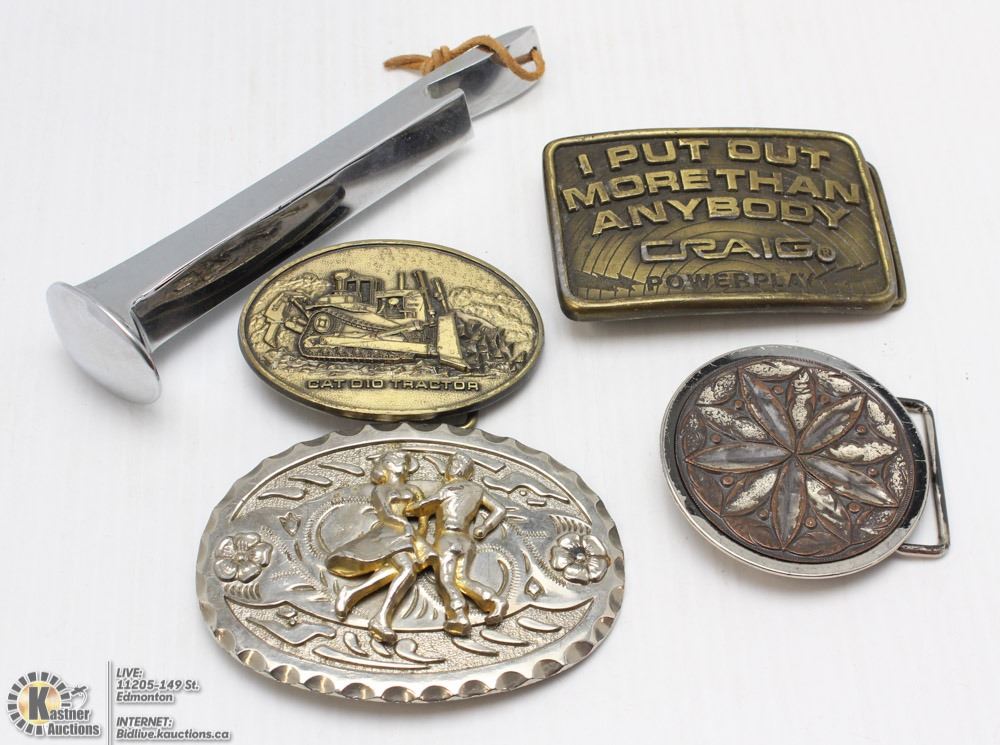 LOT OF 4 COLLECTOR BELT BUCKLES & RAILROAD SPIKE OPENER