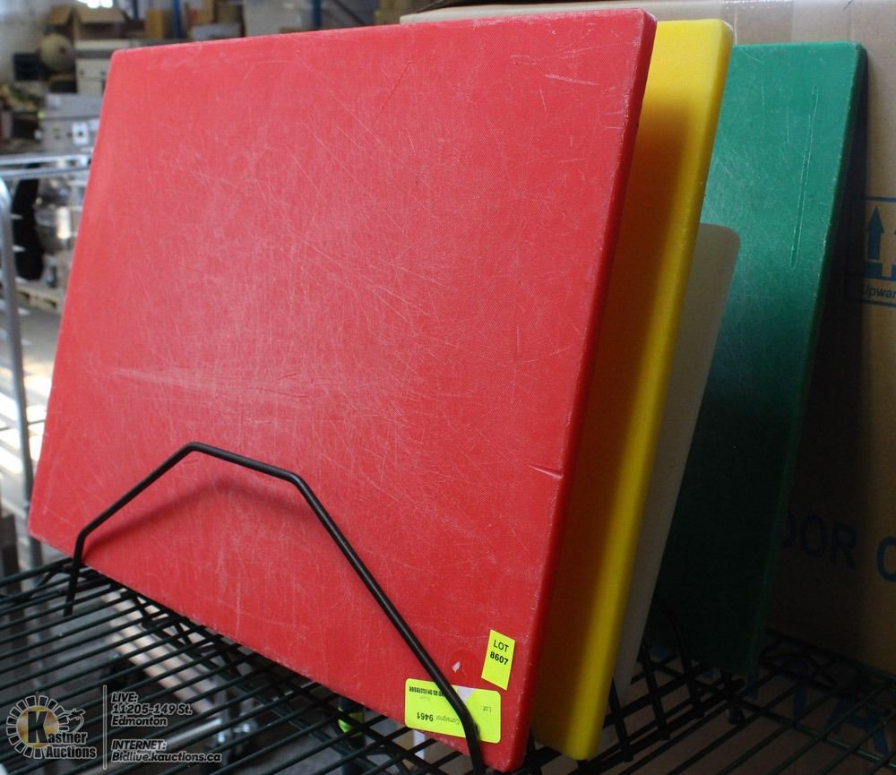 LOT OF 4 CUTTING BOARDS WITH RACK