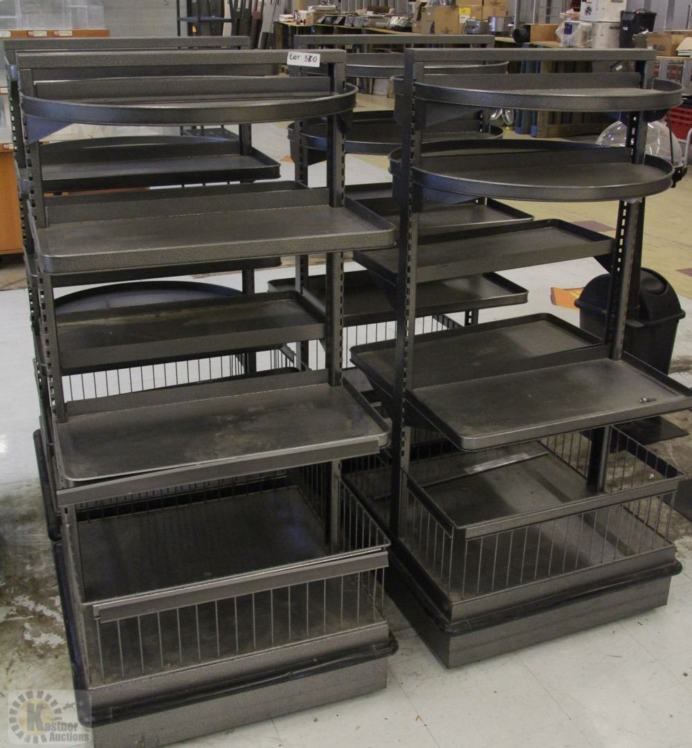 LOT OF 4 DISPLAY SHELVES ON CASTORS