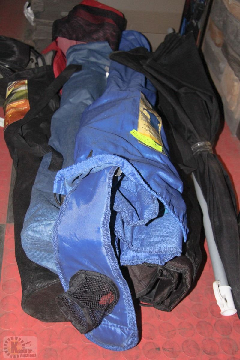 LOT OF 4 FOLD UP LAWN CHAIRS WITH FABRIC UMBRELLA