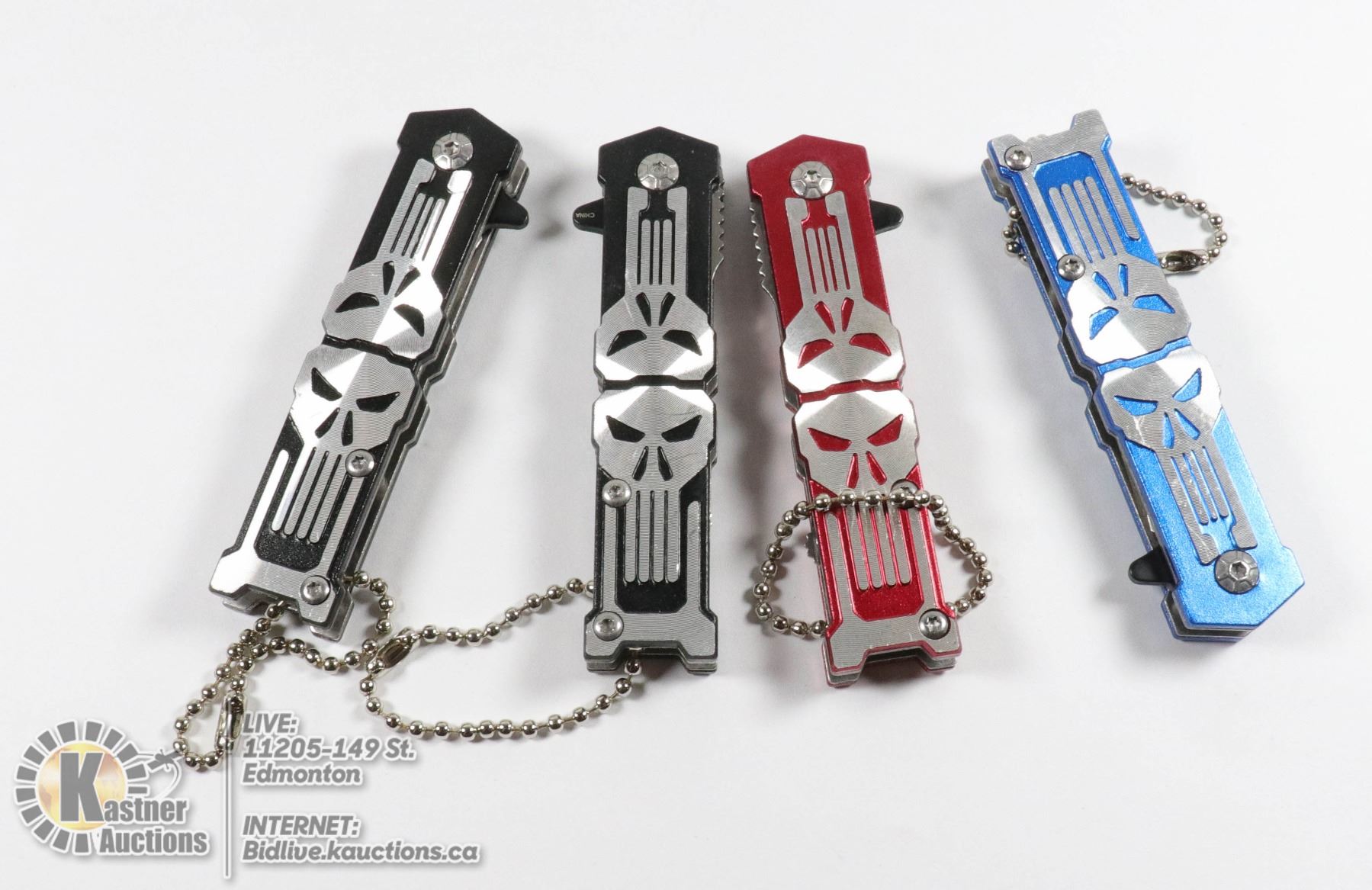 LOT OF 4 MINI SKULL KNIVES 2 BLACK, 1 RED, 1 BLUE