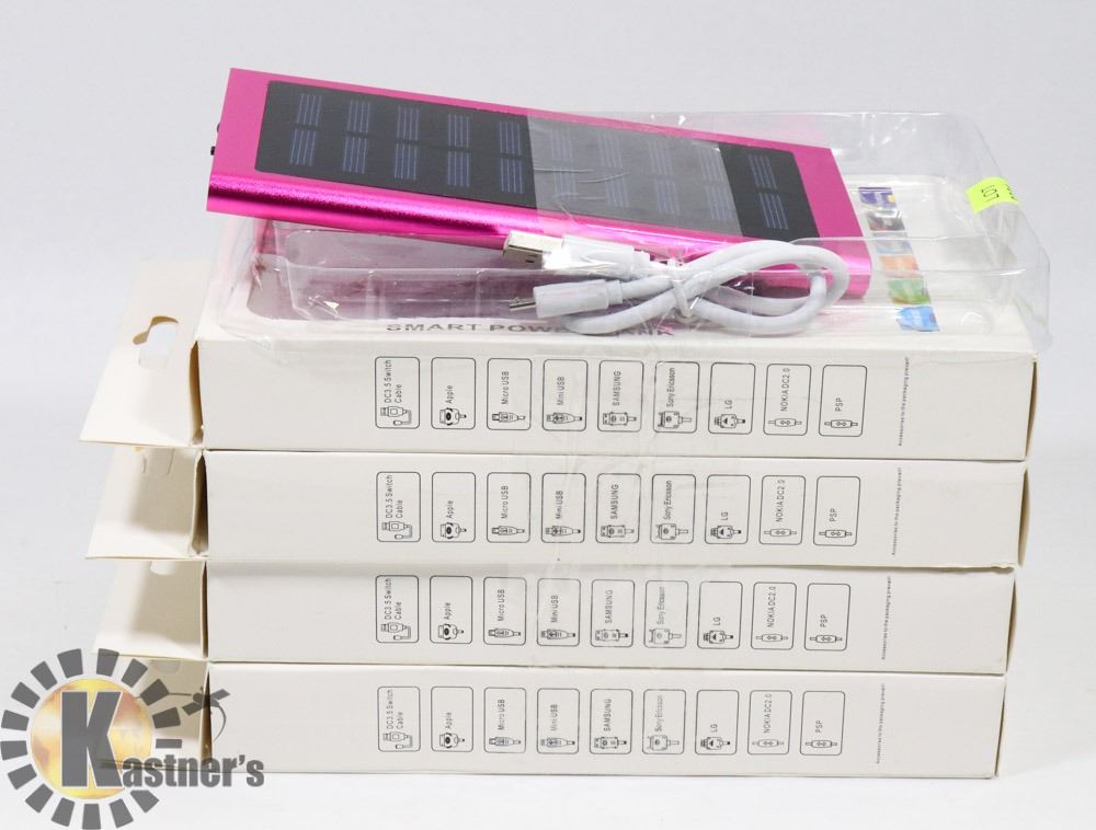 2 PINK 2 SILVER CHARGERS. EMERGENCY LED LIGHT, SHOCK PROOF, DUAL USB CHARGING PORTS. SLIM LI-POLYMER BATTERY, COMPATIBLE WITH CELL PHONES, GPS, CAMERA, VAPES ETC. INCLUDES USB FANS AND USB CHARGE CABLES.