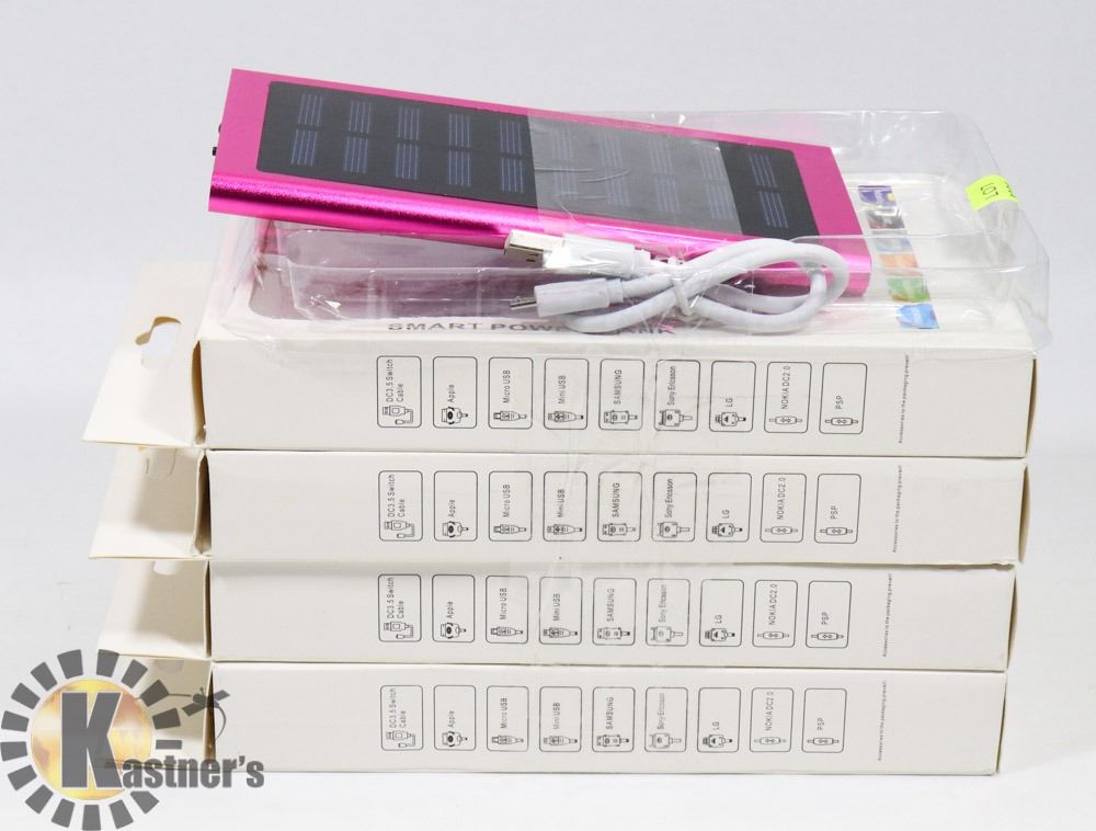 2 PINK 2 SILVER CHARGERS. EMERGENCY LED LIGHT, SHOCK PROOF, DUAL USB CHARGING PORTS. SLIM LI-POLYMER BATTERY, COMPATIBLE WITH CELL PHONES, GPS, CAMERA, VAPES ETC. INCLUDES USB FANS AND USB CHARGE CABLES.