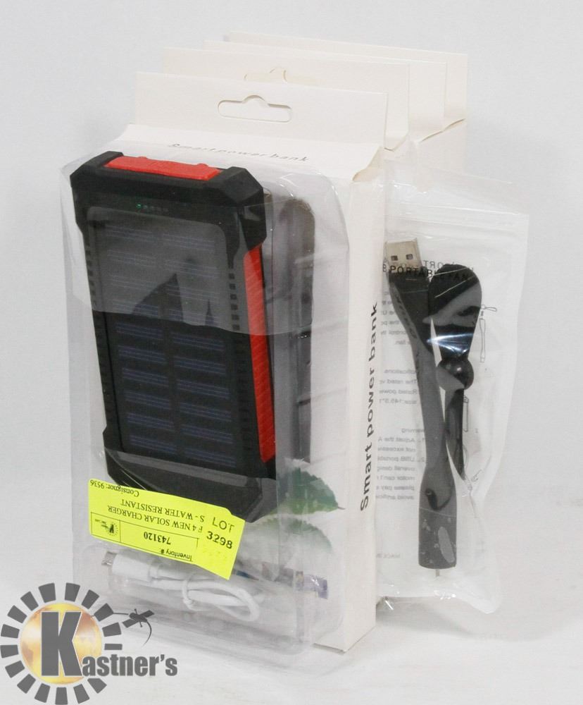 ONE ORANGE, BLUE, RED AND BLACK CHARGER. EMERGENCY LED LIGHT, SHOCK PROOF, WATER RESISTANT, DUAL USB CHARGING PORTS. LI-POLYMER BATTERY, COMPATIBLE WITH CELL PHONES, GPS, CAMERA, VAPES ETC. INCLUDES USB FANS AND USB CHARGE CABLES.
