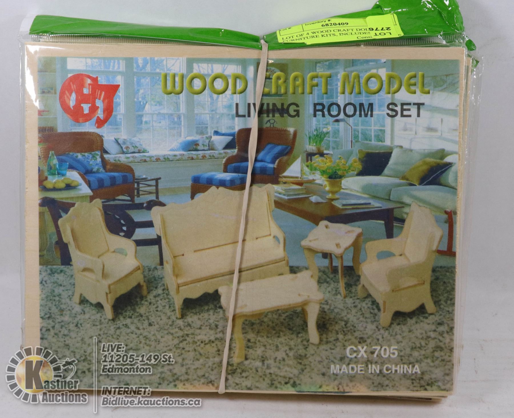 LOT OF 4 WOOD CRAFT DOLL FURNITURE KITS, INCLUDES ROOM, CHILDS BEDROOM, DINING ROOM SET, BATHROOM